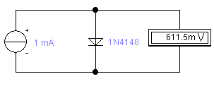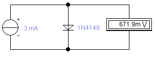 Второй путь ─ сугубо практический. Берем диод, пропускаем через него ток ,смотрим падение напряжения, записываем результаты. Далее, повышаем ток, смотрим падение напряжения, записываем результаты, после чего, расчитываем сопротивление с помощью формулы 2. Такой подход актуален, когда нужно прям очень точно расчитать сопротивление (мое мнение ─ на практике такая точность нахрен никому не нужна :)). Этим мы и займемся. В симуляторе выбираем диод, пропускаем через него ток 1 миллиампер смотрим падение напряжения при этом: