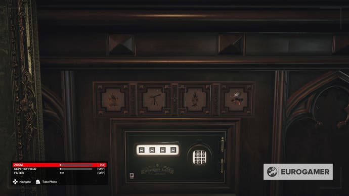 Whichever way you get into the office, you must then press the switch on the arm of the chair, moving the nearby painting to reveal the safe. Now it’s a case of entering in the safe code.