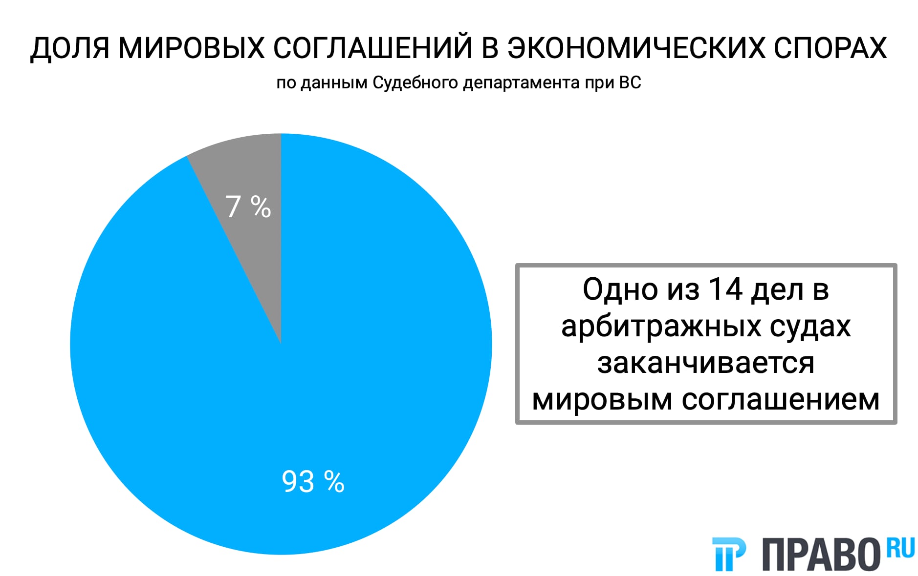 Статистическая выкладка Судебного департамента при Верховном суде показывает: стороны в арбитражном процессе все еще редко обращаются к мировым соглашениям. В 2018 году арбитражные суды первой инстанции утвердили лишь 31 059 таких соглашений – это 7% от общего числа рассмотренных споров.
