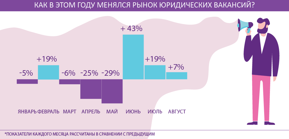 Правила поиска работы становятся вновь актуальны после пандемии. Рынок юридических вакансий действительно сильно просел в период всеобщего карантина, но как оказалось, это было временное явление. Работодатели почти мгновенно отреагировали на окончание периода самоизоляции: в июне число открытых «юридических» вакансий на портале hh.ru увеличилось сразу на 43% по сравнению с майским показателем. Затем рост продолжился. Так, в июле количество предложений для юристов выросло на 19% относительно предыдущего месяца, а в августе – еще на 7%.