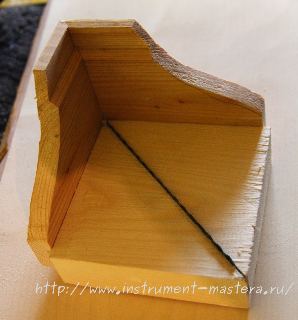 Простое самодельное приспособление для определения центра в торце цилиндрической или просто круглой заготовки. Устройство видно на фото: две деревянные дощечки (я взял обрезки вагонки скреплены, один из торцов каждой из которых отпилен под углом 45 градусов прикреплены к ещё одной деревяшке — основанию квадратной формы. В ней с угла на угол сделан запил, в который вставлен обломок полотна от ножовки по металлу.
