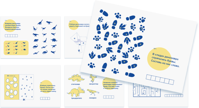 15 заданий, каждое посвящено одному из видов динозавров. В конце все задания складываются в гигантский пазл.