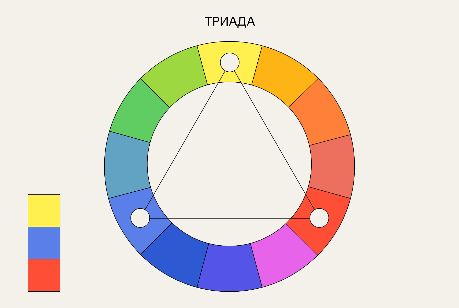 2. Триаду, или три цвета, используют, когда нужно показать мягкий контраст. Найти такие цвета легко — достаточно нарисовать внутри круга равносторонний треугольник. Его вершины и будут теми цветами, которые гармонируют друг с другом.