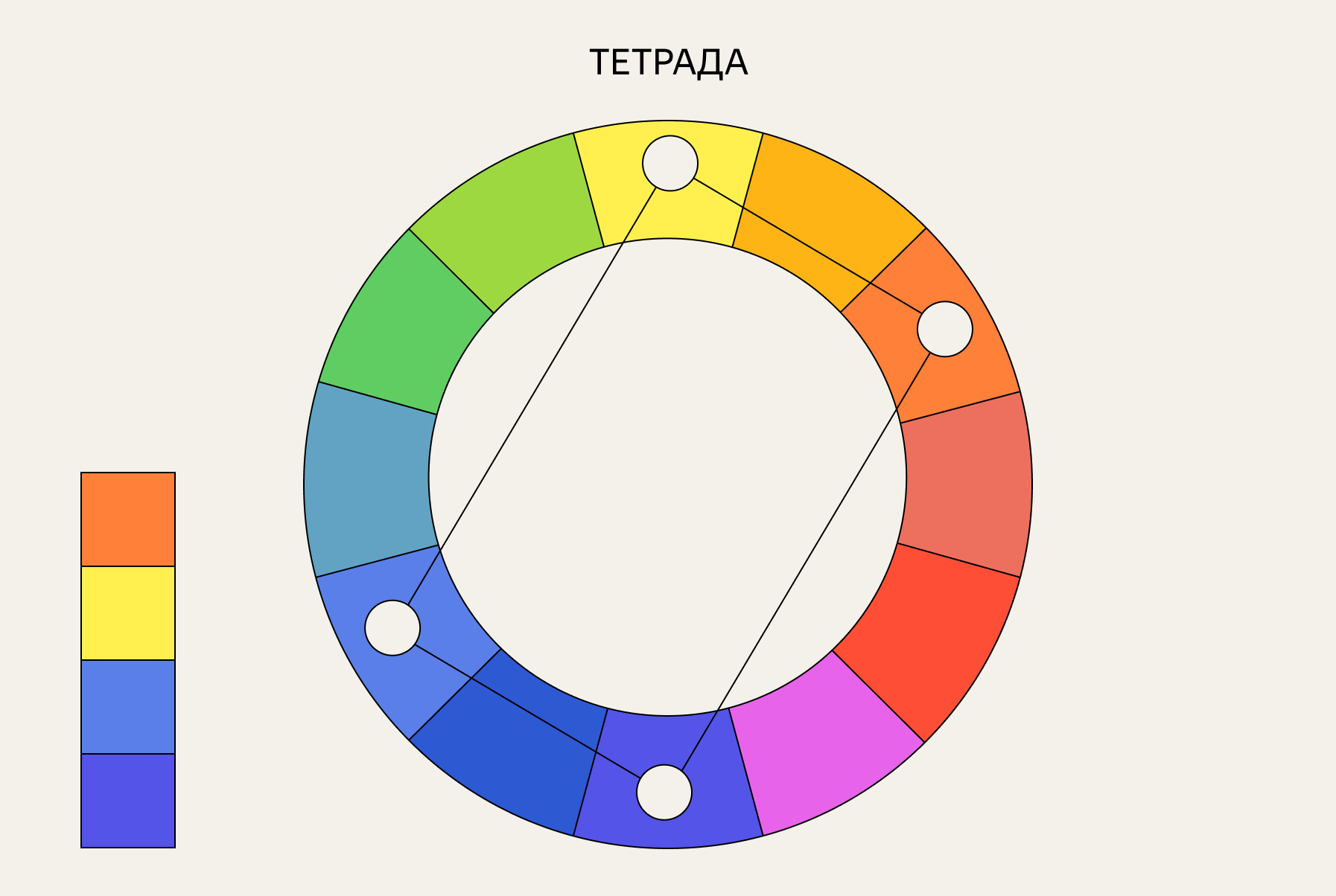 5. Тетрада. Сочетание четырёх цветов по углам квадрата. По сути, здесь представлено сочетание из двух пар дополнительных цветов. Подходит, если вам нужно создать красочное и разнообразное изображение.
