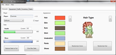 TerrariViewer (http://terrariviewer.codeplex.com/) позволяет настроить внешний вид персонажа, характеристики, Ману и изменить инвентарь избавив вас от долгих поисков и фарминга редких предметов.