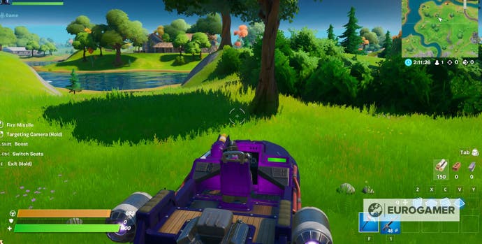 Вы можете управлять лодками Fortnite по суше — и вы можете двигаться впечатляюще быстро, если вы повысите скорость, — но он медленно улетает на здоровье машины, расходуя один урон в секунду. Они также оснащены ракетной установкой, которая наносит серьезный урон за выстрел, но между выстрелами довольно много времени, поэтому убедитесь, что вы точны. Используйте прицельную камеру, если вам нужно, которая уменьшает дальше, чем обычный вид.