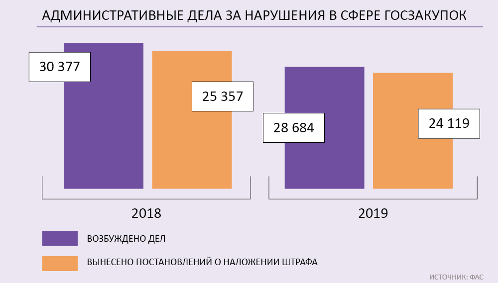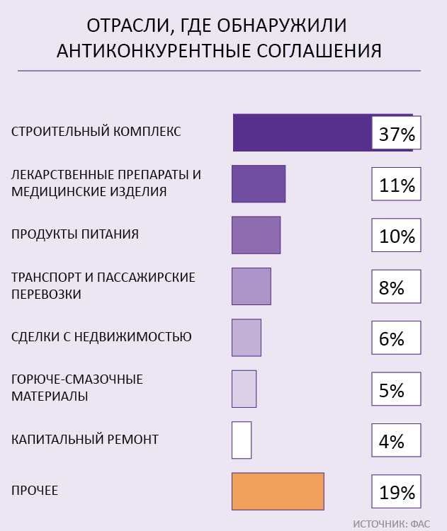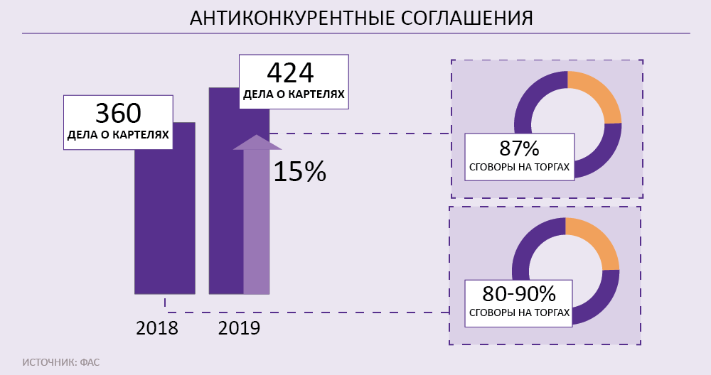Но недобросовестное поведение встречается и при проведении закупки. Оно выражается в сговоре отдельных подрядчиков, которые хотят повлиять на результаты конкурентных процедур, отмечает Фадеев: «Такой сговор может иметь признаки антиконкурентных соглашений. Например, картеля». При этом в них принимают участие госорганы и их работники, указывает в своем докладе ФАС. За 2019 год антимонопольщики возбудили 320 дел о заключении антиконкурентных соглашений с участием органов власти – это на 6% больше, чем в позапрошлом году.