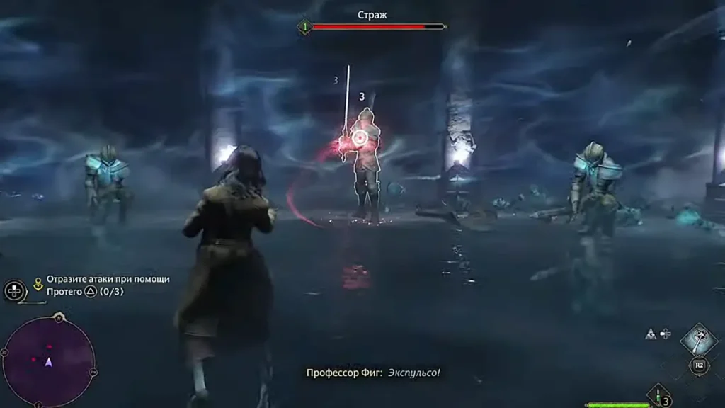 После решения головоломки начнется финальный бой квеста, в котором вас обучат механике контратаки. Для того чтобы контратаковать – удерживайте кнопку применения «Протего» (Q/Треугольник/Y) во время атаки противника. Враг будет оглушен, и вы сможете нанести ему дополнительный урон.