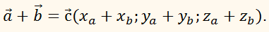 Суммой векторов a (на рисунке зелёный вектор) и b (на рисунке синий вектор) называется третий вектор c (на рисунке красный вектор) , получаемый следующее построение: