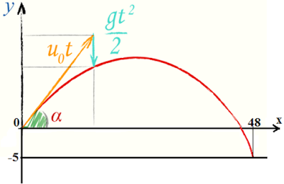 Если начало координат совместить с точкой балкона, то в момент падения на землю согласно условию y=-5, x=48