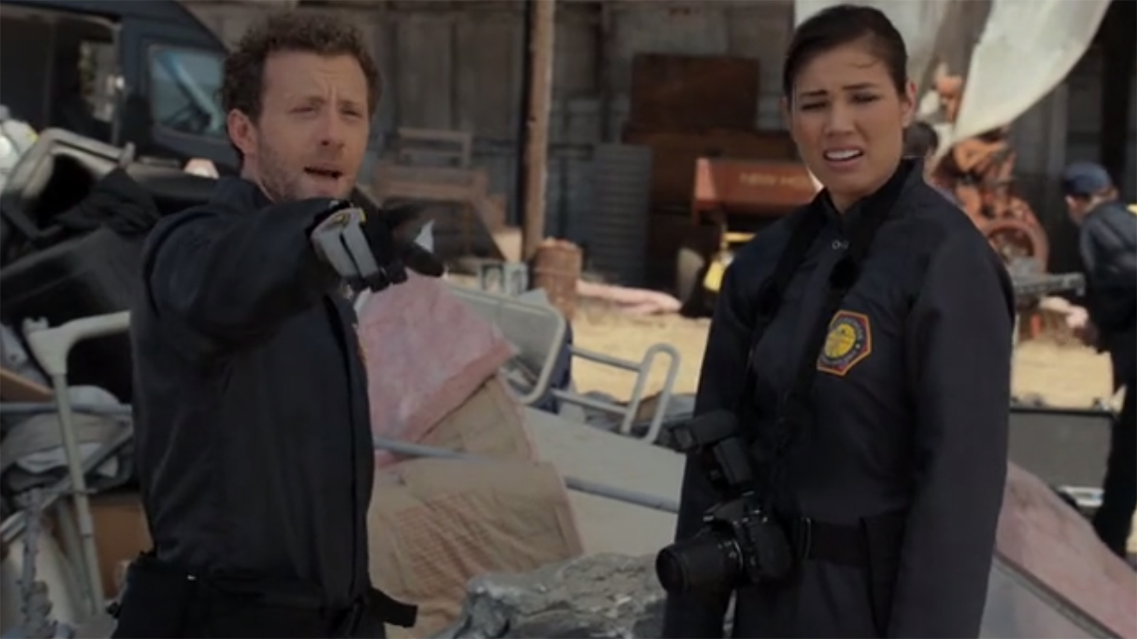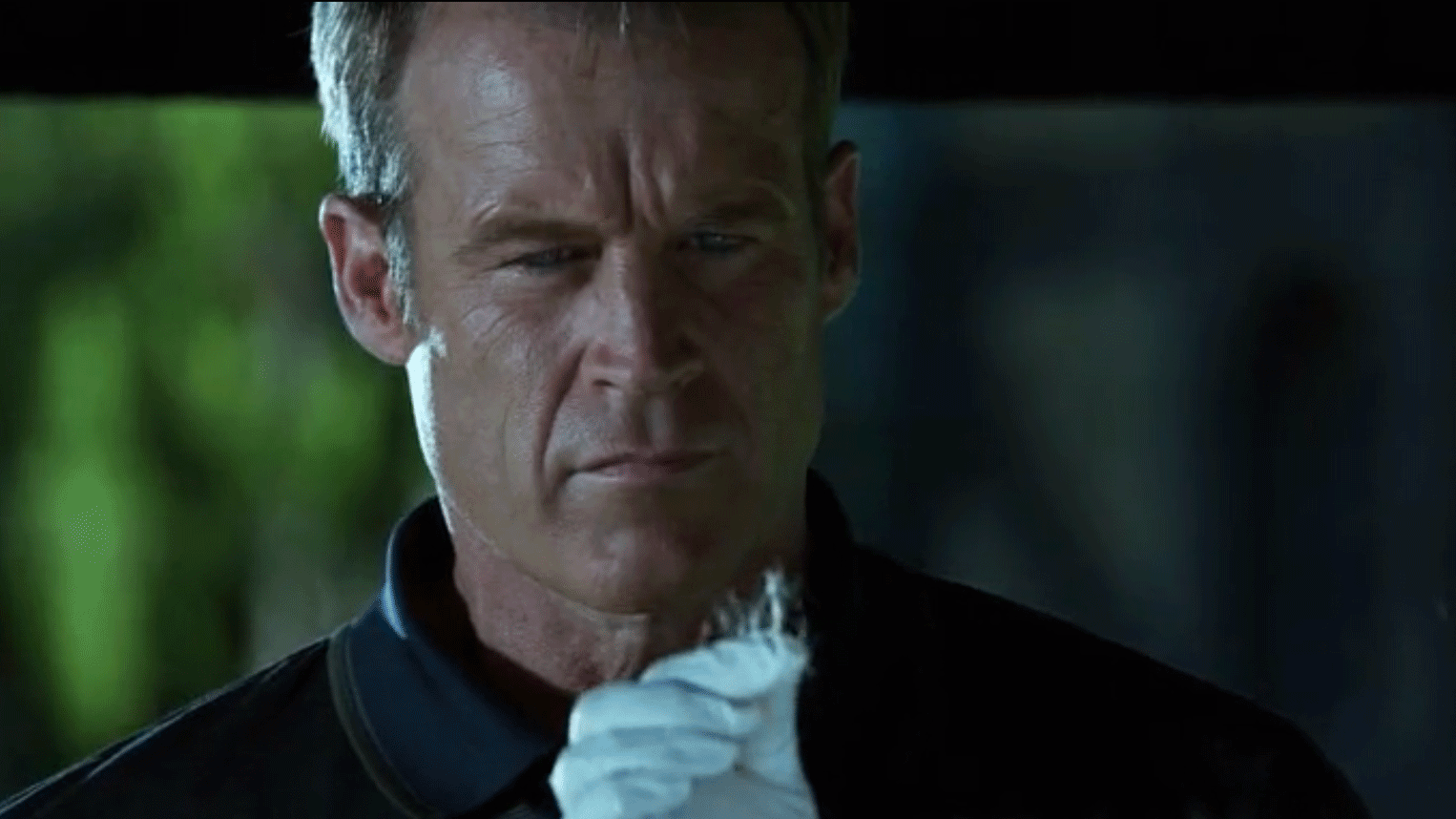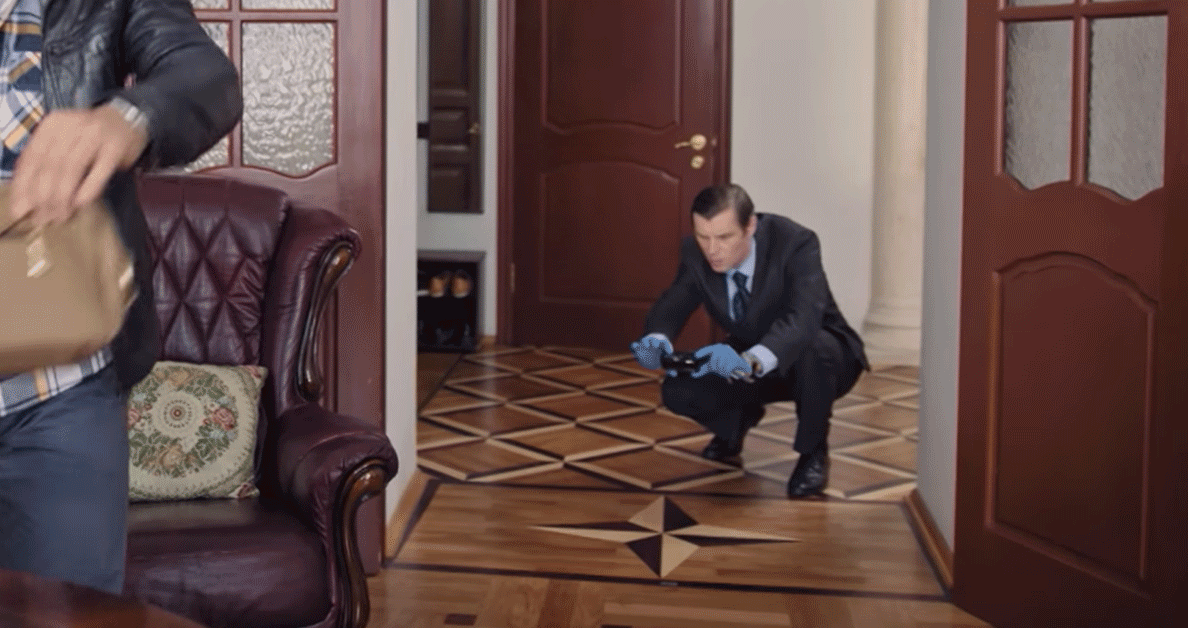 Зато тут в руках у героя профессиональная камера с кольцевой вспышкой, что плюс. Однако минус в том, что снимает он не по правилам криминалистической фотосъёмки: не перпендикулярно плоскости объекта и без масштабной линейки.