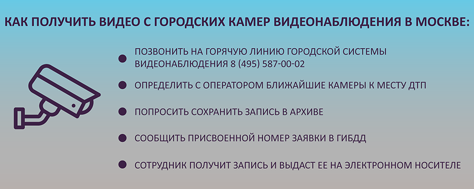 - Помните про видеонаблюдение. Осмотрите место ДТП и подумайте, на какие камеры оно могло бы попасть. Обращайтесь к собственникам камер максимально быстро, чтобы видео не исчезло с видеорегистратора.
