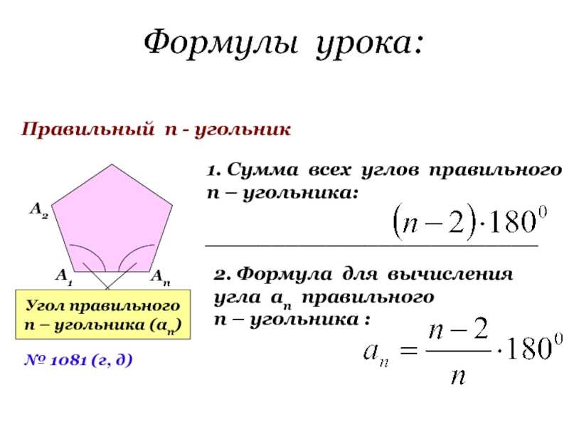 - Величина α внутренних углов правильного пятиугольника (n=5) составляет: