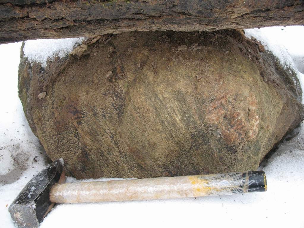 Прошел трактор и своей лопатой срубил мелкие сосенки. сгреб снег, немного обнажилась земля. Поверхность земли хоть и заморожена, но вести поиск пегматитовой жилы позволяет.. Основное — это, как минимум, знать как выглядят кусочки пегматита. Найдя их можно с большой уверенностью предположить наличие в этом районе пегматитовой жилы. Найти жилу — это половина дела, но самая важная. Найдя жилу можно надеяться на успешный поиск хрусталей, берилла
