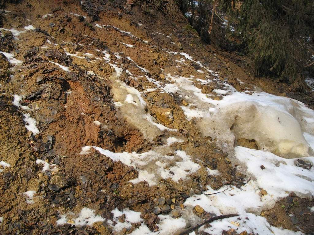 Хорошо, что весна оголила борта оврага, но под слоем растаявшего грунта лед и тяжело подниматься к осыпям. Их обследование оставил до лучших времен.