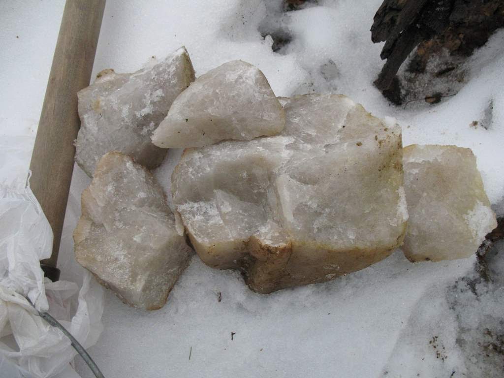 Прошел трактор и своей лопатой срубил мелкие сосенки. сгреб снег, немного обнажилась земля. Поверхность земли хоть и заморожена, но вести поиск пегматитовой жилы позволяет.. Основное — это, как минимум, знать как выглядят кусочки пегматита. Найдя их можно с большой уверенностью предположить наличие в этом районе пегматитовой жилы. Найти жилу — это половина дела, но самая важная. Найдя жилу можно надеяться на успешный поиск хрусталей, берилла