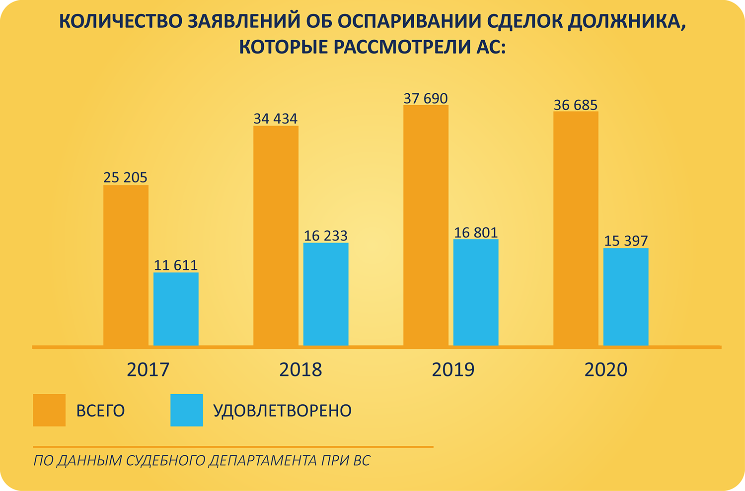 Это означает наиболее полное удовлетворение требований кредиторов. Если обратиться к статистике, то ежегодно количество заявлений об оспаривании сделок должника только увеличивается, а суды все чаще удовлетворяют такие требования. Прошлый год «выпадает» из этой тенденции. Возможно, на цифрах отразился действовавший тогда банкротный мораторий.