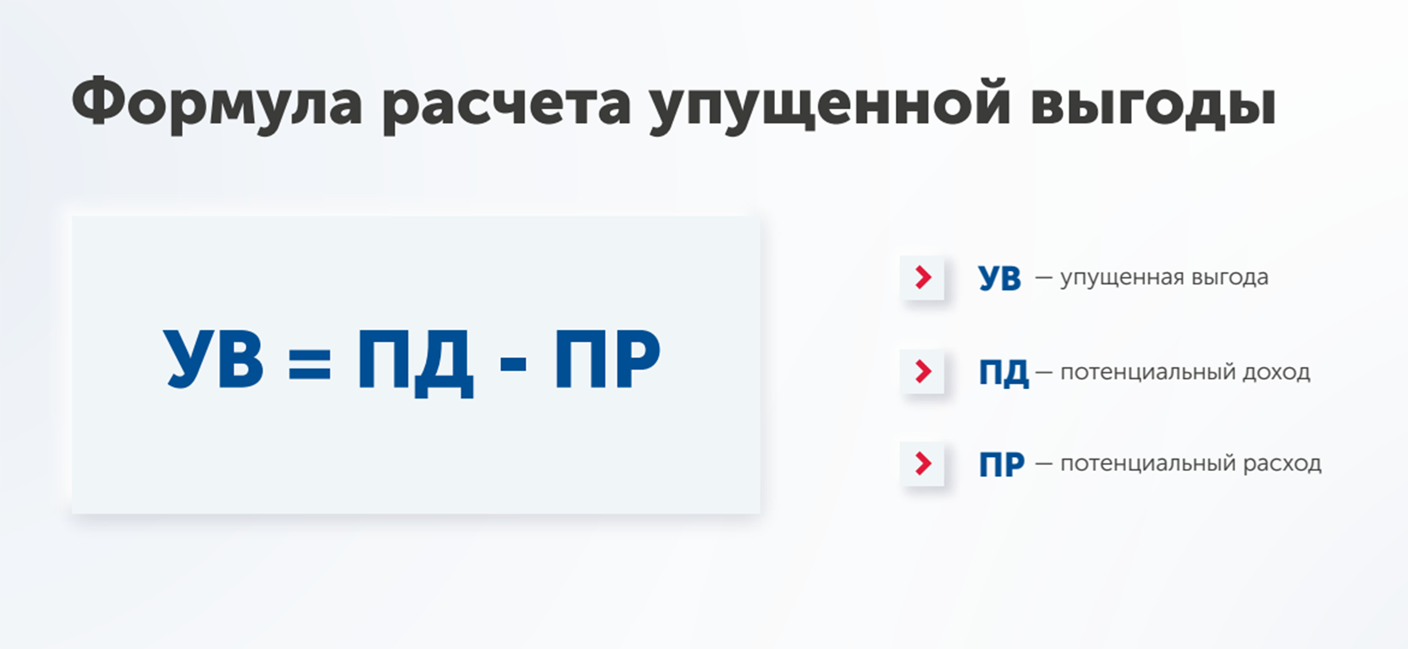 Чтобы рассчитать реальный размер упущенной выгоды из-за неправомерных действий оппонента, применяют полную формулу расчета. Она показывает, сколько в действительности потеряла сторона с учетом причинно-следственной связи, митигации и коэффициента времени. Учет этих факторов помогает убедить суд в своей позиции.