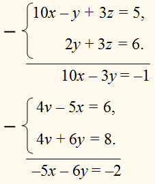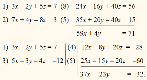Из трех способов решения этих систем: графического, способа подстановки и способа сложения остается два последних способа. Графический способ уже не проходит, так как пришлось бы находить точку пересечения трех плоскостей. А это трудно изобразить.