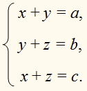 Ответ:$ {left{ begin{array}{c} x = -(a+b+c) \ y = ab+ac+bc \ z = -abc end{array} right.} $