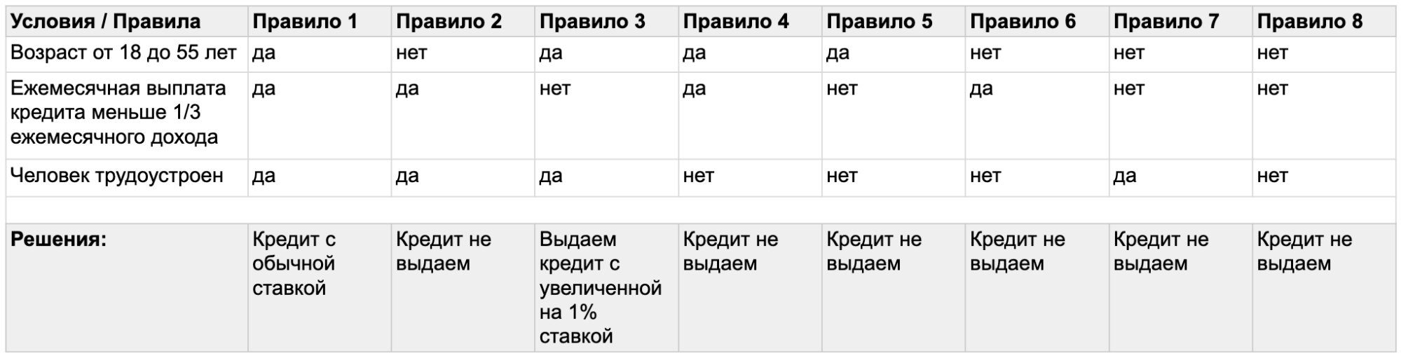 Отличный метод не упустить все возможные сценарии — сделать таблицу решений (Decision Table, DT), где решения описаны в наглядной, легко читаемой форме.