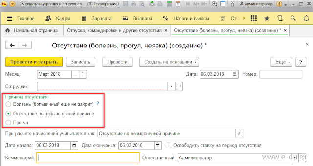 Возвращаемся к документу отражения невыхода в 1С и заполняем его.