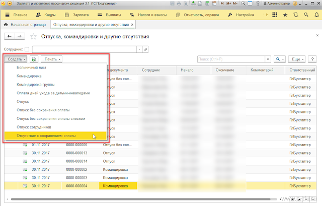 К примеру, у сотрудника организации произошло форс-мажорное обстоятельство, тогда в программе создается документ “Отсутствие с сохранением оплаты”.