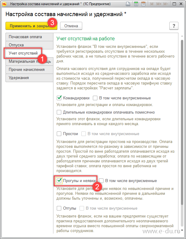 Шаг 2. Перейдите по гиперссылке «Настройка состава начислений и удержаний». В меню «Учет отсутствий» установите галочку «Прогулы и неявки».