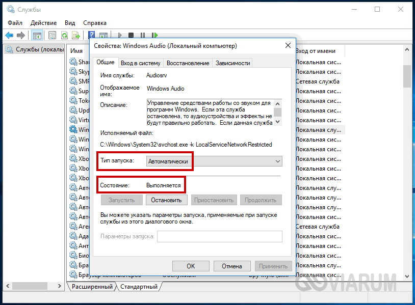 в окошке «Выполнить» оснастку управления службами, найдите в списке службу Windows Audio и откройте ее свойства. Убедитесь, что тип запуска выставлен «Автоматически», а сама служба имеет статус «Запущена».