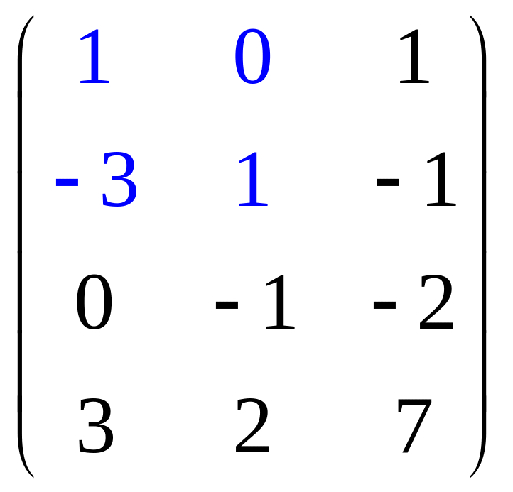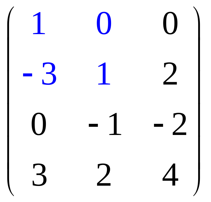 При помощи элементарных преобразований приведём данную матрицу к ступенчатому виду. На первом шаге умножим последовательно первую строку на 3, 3, 2 и вычтем из второй, третьей, четвёртой строк соответственно: