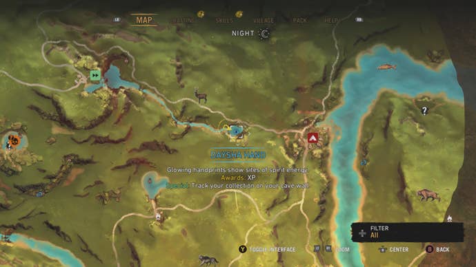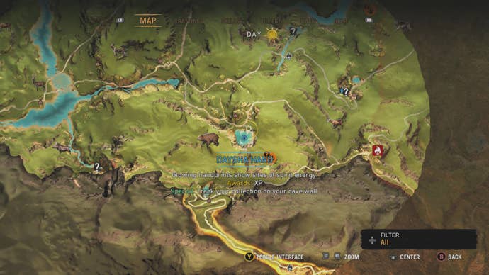 Daysha Hands are small white handprints stamped on rocks, signifying the presence of spirit energy in an area. On the world map, Daysha Hands are indicated with a blue icon of a handprint on a rock. This icon is not to be confused with the Cave Painting icon, which is a solitary blue hand.