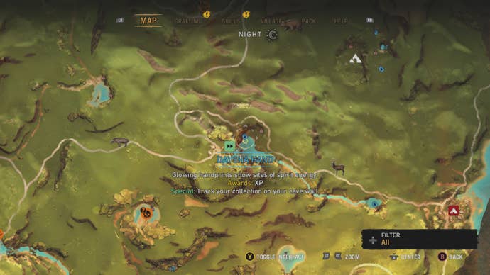 Мы помещаем Тотемы Духа, чтобы попросить призраков об успешной и безопасной охоте. Это характерные места из камня и других природных ресурсов. Просто подойдите к ним и взаимодействуйте, чтобы надеть тотем.