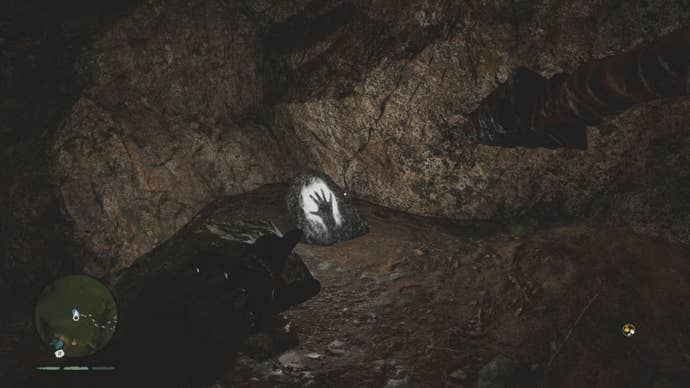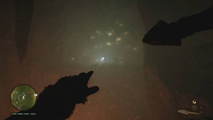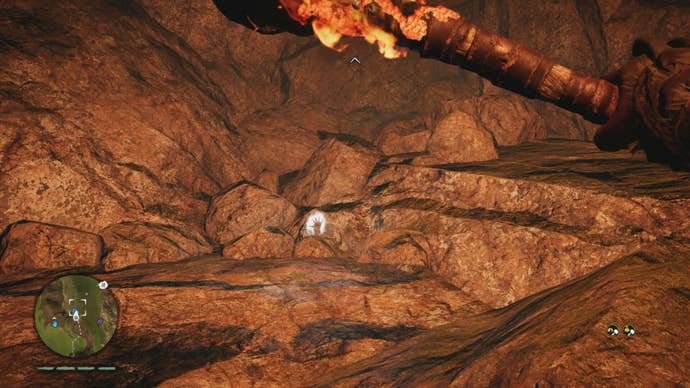 This cave can be tricky to navigate, so make sure you ignite your club to light your way. Use your Hunter Senses to locate a campfire with red tracks beside it. The Daysha Hand is on a ledge above the campfire.