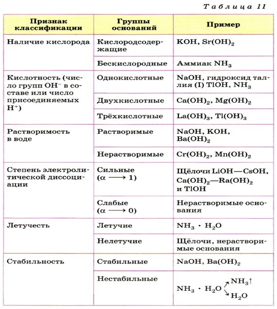 Классификация оснований базируется на их растворимости в воде и по числу ОН-групп.