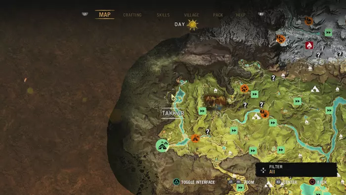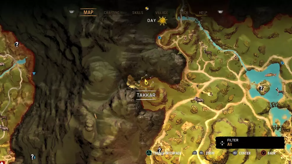 To find the next Hunter Cache you’ll need to head to Takkar’s Cave and then make your way out of the Wenja village beside Karoosh’s hut. Follow the western edge of the map north until you spot this painting in a small recess in the rock.