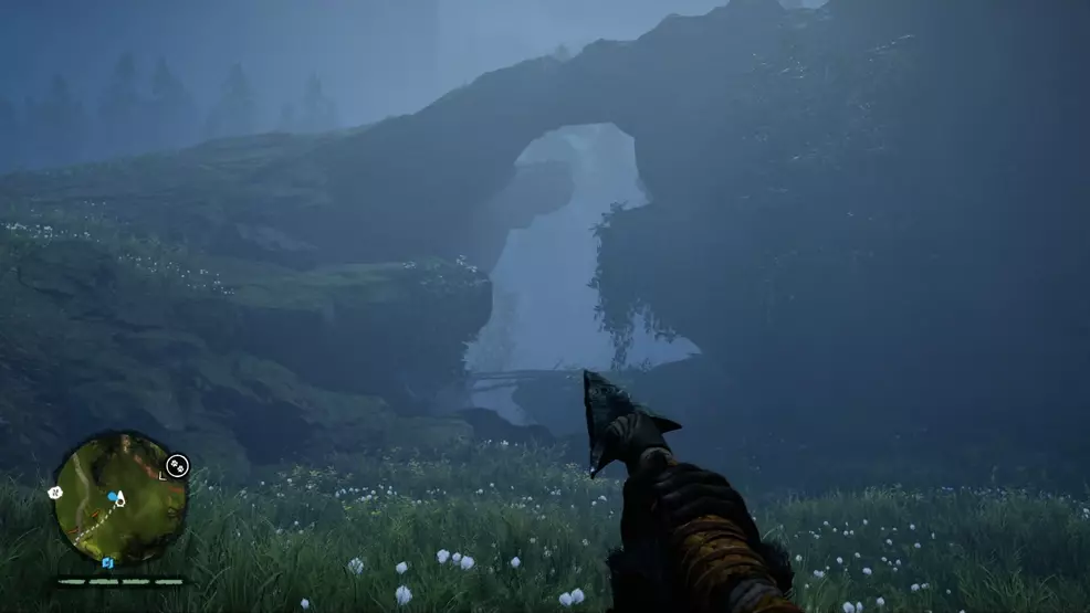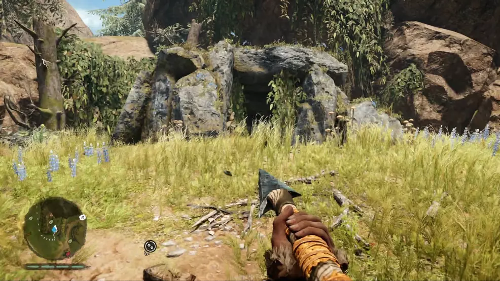 Once you’ve spotted the painting do a quick analysis and then make your way back around the edge of the area until you spot the blue painted standing stone on your left. There should be a stone hut up the hill from the standing stone. Head into the hut and use your Hunter Vision behind the Izila altar to find this cache of rare supplies.