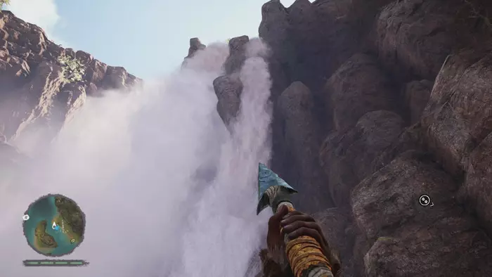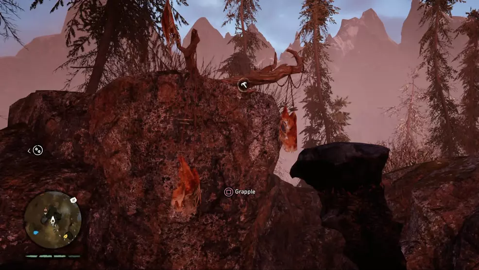 Once you’ve located the painting turn around and locate the nearby gorge with a small waterfall flowing into it. Use Takkar’s Grappling Claw to hook to the nearby grapple point and then head down into the gorge. Don’t go too deep down, as the bottom is empty and littered with toxic gas. Use your Hunter Vision to locate the entrance to an animal’s cave and head inside, following the trail of dead fish until you spot this pile of rare supplies waiting to be liberated.