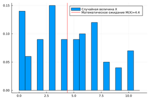 Математическое ожидание случайной величины [math]displaystyle{ X }[/math], принимающей значения [math]displaystyle{ [0, 1, 2, 3, 4, 5, 6, 7, 8, 9, 10] }[/math] с разной вероятностью. Математическое ожидание [math]displaystyle{ mathbb{E}(X)=4,4 }[/math]